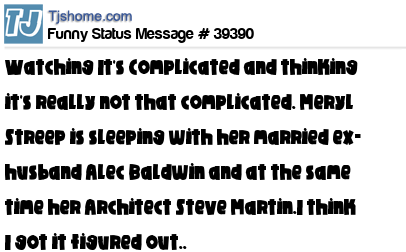 X is watching It's Complicated and thinking it's really not that complicated. Meryl Streep is sleeping with her married ex- husband Alec Baldwin and at the same time her Architect Steve Martin.I think I got it figured out..