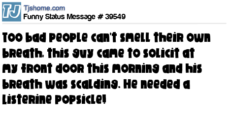 X Too bad people can't smell their own breath, this guy came to solicit at my front door this morning and his breath was scalding. He needed a Listerine popsicle!