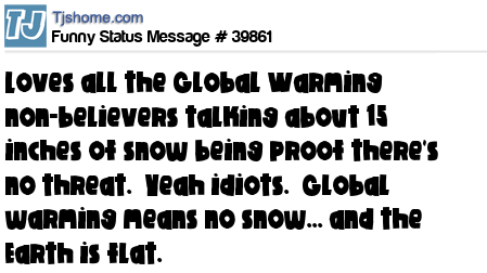 X is Loves all the Global Warming non-believers talking about 15 inches of snow being proof there's no threat. Yeah idiots. Global warming means no snow... and the Earth is flat.