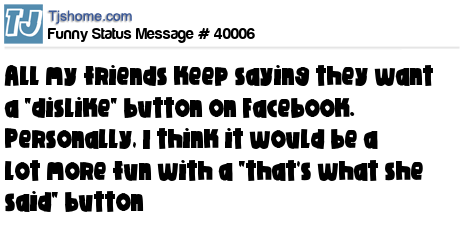 - # 40007 My friends keep saying that they wish there was a "dislike" button on Facebook. Personally, I would have a lot more fun with a "That's what she said" button