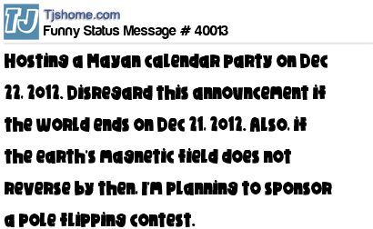 X is hosting a Mayan calendar party on Dec 22, 2012. Disregard this announcement if the world ends on Dec 21, 2012. Also, if the earth's magnetic field does not reverse by then, I'm planning to sponsor a pole flipping contest.