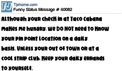 X Although your check in at Taco Cabana makes me hungry, we DO NOT need to know your pin point location on a daily basis. Unless your out of town or at a cool strip club, keep your daily errands to yourself.