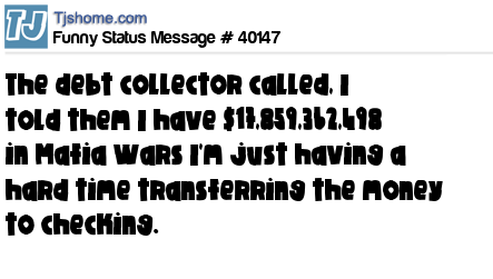 X the debt collector called, I told them I have $17,859,362,498 in Mafia Wars I'm just having a hard time transferring the money to checking.