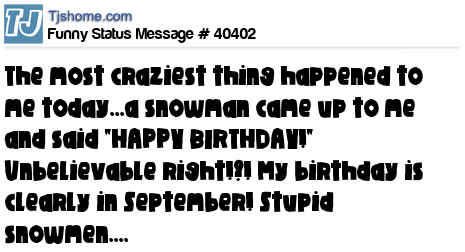 X The most craziest thing happened to me today...a snowman came up to me and said "HAPPY BIRTHDAY!" Unbelievable right!?! My birthday is clearly in September! Stupid snowmen....