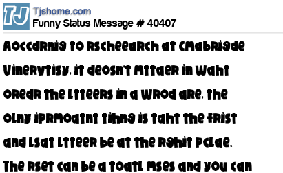 - # 27579 Aoccdrnig to a rscheearch at an Elingsh uinervtisy, it deosn't mttaer in waht oredr the ltteers in a wrod are, the olny iprmoetnt tihng is taht frist and lsat ltteer is at the rghit pclae. The rset can be a toatl mses and you can sitll raed it wouthit por