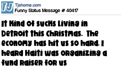 X It kind of sucks living in Detroit this Christmas. The economy has hit us so hard, I heard Haiti was organizing a fund raiser for us
