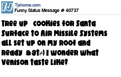 X tree up☑ cookies for Santa☑ Surface to Air Missile Systems all set up on my roof and ready☑>:) I wonder what Venison taste like?