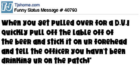 - # 30744 i think next time I'm out drinkin I'm gunna pull the label of my last beer and stick it on my shoulder just in case I get pulled over... that way I can say "no I havent officer, I'm on the patch"