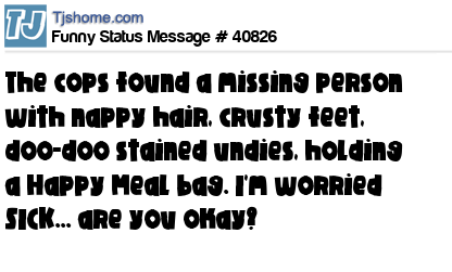 X is The cops found a missing person with nappy hair, crusty feet, doo-doo stained undies, holding a Happy Meal bag. I'm worried SICK... are you okay?