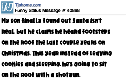 X is My son finally found out Santa isn't real, but he claims he heard footsteps on the roof the last couple years on Christmas. This year instead of leaving cookies and sleeping, he's going to sit on the roof with a shotgun.