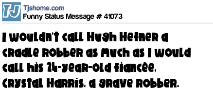 X  I wouldn't call Hugh Hefner a cradle robber as much as I would call his 24-year-old fiancée, Crystal Harris, a grave robber.