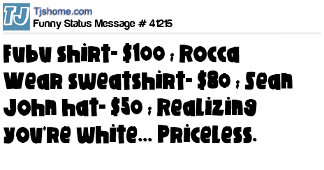 X Fubu shirt- $100 ; Rocca Wear sweatshirt- $80 ; Sean John hat- $50 ; Realizing you're white... Priceless.