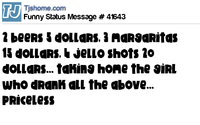 - # 53311 2 beers $12, 3 margaritas $15, 4 jello shots $20 dollars, taking home the girl who drank all the above... priceless