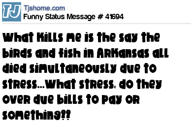X says What kills me is the say the birds and fish in Arkansas all died simultaneously due to stress...What stress, do they over due bills to pay or something??