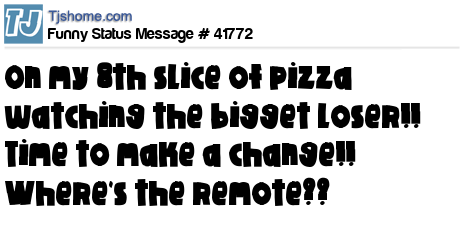 X On my 8th slice of pizza watching the bigget loser!! Time to make a change!! Where's the remote??