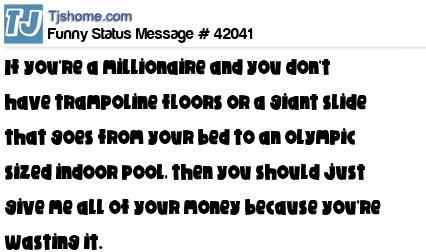 X If you're a millionaire and you don't have trampoline floors or a giant slide that goes from your bed to an olympic sized indoor pool, then you should just give me all of your money because you're wasting it.