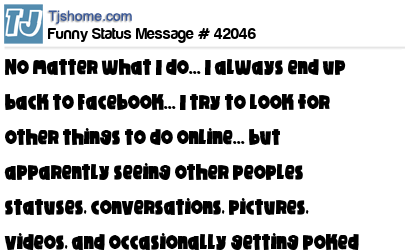 X No matter what I do... I always end up back to Facebook... I try to look for other things to do online... but apparently seeing other peoples statuses, conversations, pictures, videos, and occasionally getting poked entertains me...