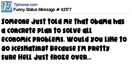 X is Someone just told me that Obama has a concrete plan to solve all economic problems. Would you like to go iceskating? Because I'm pretty sure Hell just froze over...