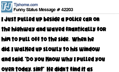X I just pulled up beside a police car on the highway and waved frantically for him to pull off to the side. When he did, I walked up slowly to his window and said, "Do you know why I pulled you over today, sir?" He didn't find it as amusing as me.......