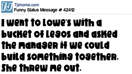 - # 41182 took a bucket of Legos to Lowes and asked the cute manager "Let's build something together" that's when I got thrown out of Lowe's.