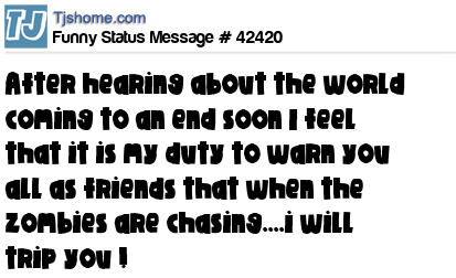 X after hearing about the world coming to an end soon I feel that it is my duty to warn you all as friends that when the zombies are chasing....i will trip you !