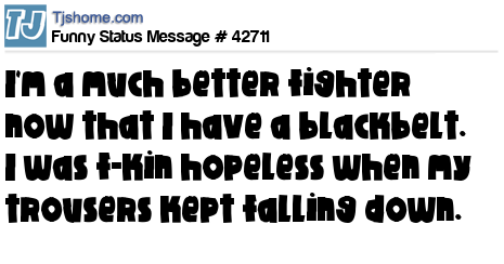 X I'm a much better fighter now that I have a blackbelt. I was f-kin hopeless when my trousers kept falling down.