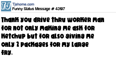 X Thank you drive thru worker man for not only making me ask for ketchup but for also giving me only 2 packages for my large fry.