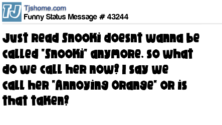 X just read Snooki doesnt wanna be called "Snooki" anymore. so what do we call her now? I say we call her "Annoying Orange" or is that taken?