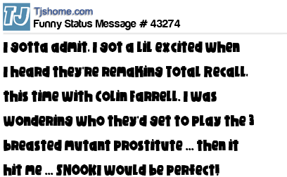 X  I gotta admit, I got a lil excited when I heard they're remaking Total Recall, this time with Colin Farrell. I was wondering who they'd get to play the 3 breasted mutant prostitute ... then it hit me ... SNOOKI would be perfect!