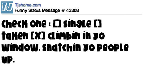 X Check One : [] single [] taken [X] climbin in yo window, snatchin yo people up.