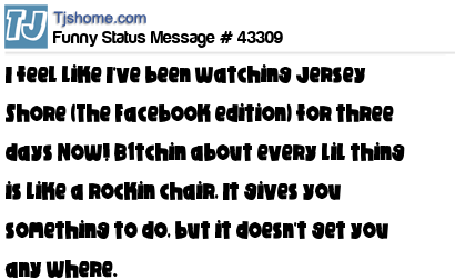 X I feel like I've been watching Jersey Shore (The Facebook edition) for three days Now! B1tchin about every lil thing is like a rockin chair, It gives you something to do, but it doesn't get you any where.