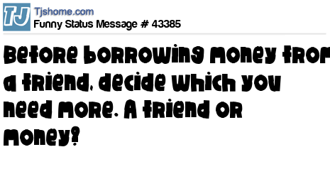 - # 125495 If you are my friend on Facebook and you need money, don't ask because I have no money. If you are family, or a friend, may I borrow some money? If you are a female and cute, don't worry, I have lots of money $$$