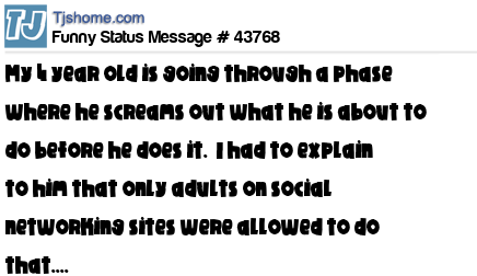 - # 86729 My 2 year old is going through a phase where she screams out what she is about to do before she does it. I had to explain to her that only adults on social networking sites were allowed to do that. :)