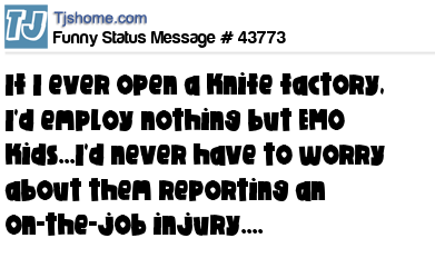 X If I ever open a knife factory, I'd employ nothing but EMO kids...I'd never have to worry about them reporting an on-the-job injury....