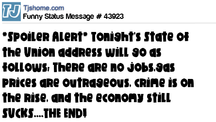 X says *Spoiler Alert* Tonight's State of the Union address will go as follows; There are no jobs,gas prices are outrageous, crime is on the rise, and the economy still SUCKS....THE END!