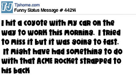 X says I hit a coyote with my car on the way to work this morning. I tried to miss it but it was going to fast. It might have had something to do with that ACME rocket strapped to his back
