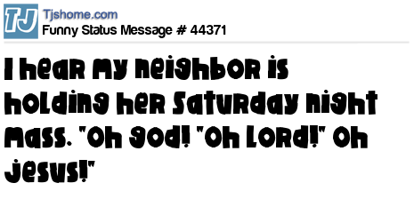 X I hear my neighbor is holding her Saturday night mass. "Oh god! "Oh lord!" Oh jesus!"