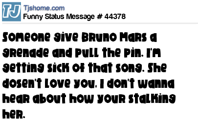 X Someone give Bruno Mars a grenade and pull the pin. I'm getting sick of that song. She dosen't love you, I don't wanna hear about how your stalking her.