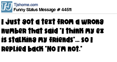 X says I just got a text from a wrong number that said "I think my ex is stalking my friends"... so I replied back "No I'm not."