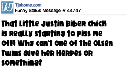 X That little Justin Biber chick is really starting to piss me off! Why can't one of the Olsen Twins give her Herpes or something?