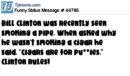 X is Bill Clinton was recently seen smoking a pipe. When asked why he wasn't smoking a cigar he said, ''Cigars are for pu**ies." Clinton rules!