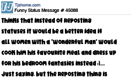 X  thinks that instead of reposting statuses it would be a better idea if all women with a "wonderful man" would cook him his favourite meal and dress up for his bedroom fantasies instead ;).... just saying, but the reposting thing is cool too.
