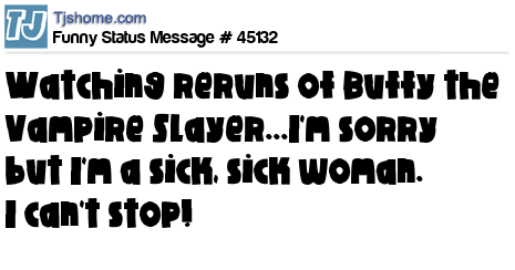 X says Watching reruns of Buffy the Vampire Slayer...I'm sorry but I'm a sick, sick woman. I can't stop!