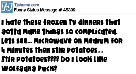 X says I hate these frozen TV dinners that gotta make things so complicated. Lets see... microwave on medium for 4 minutes then stir potatoes.... Stir potatoes???? Do I look like Wolfgang Puck?