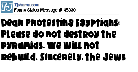 - # 45717 "Egypt.......please don't destroy the pryamids. We won't rebuild them." -- The Jews