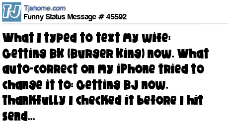 X What I typed to text my wife: Getting BK (Burger King) now. What auto-correct on my iPhone tried to change it to: Getting BJ now. Thankfully I checked it before I hit send...