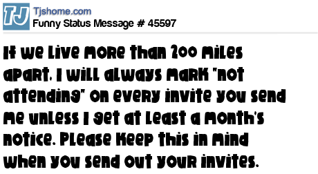X If we live more than 200 miles apart, I will always mark "not attending" on every invite you send me unless I get at least a month's notice. Please keep this in mind when you send out your invites.