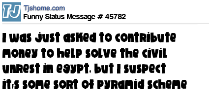 - # 45753 just asked if I wanted to contribute money to help ease the political unrest in Egypt.... For some reason I just can't get passed my initial worry that this could turn out to be a Pyramid Scheme