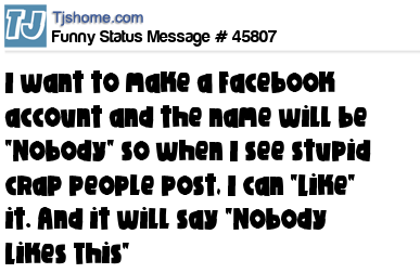 - # 68401 I want to make a Facebook account and the name will be Nobody so when I see stupid crap people post, I can Like it. And it will say Nobody Likes This.