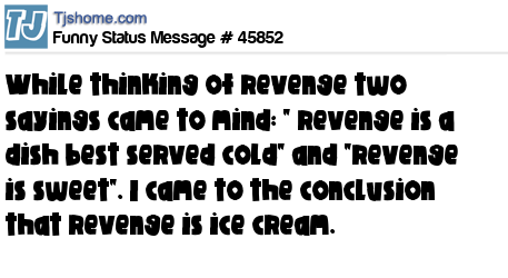 - # 183526 While thinking of revenge two sayings came to mind: " revenge is a dish best served cold" and "revenge is sweet". I therefore came to the conclusion that revenge is ice cream.